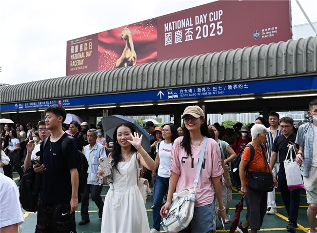 适逢内地十一黄金周,沙田马场布满国庆主题装饰,洋溢着浓厚的节庆氛围,场内人潮涌动,气氛热烈。“国庆赛马日”作为香港独具特色的文旅名片,已成为海内外游客感受香港多元文化魅力的热门之选,赛马旅游更成为假期消费新亮点。来自广州的游客张先生表示:“今天在马场我既感受到赛马的激情与这座城市的活力,也体会到香港浓厚的爱国情怀和‘一国两制’下的繁荣稳定。”