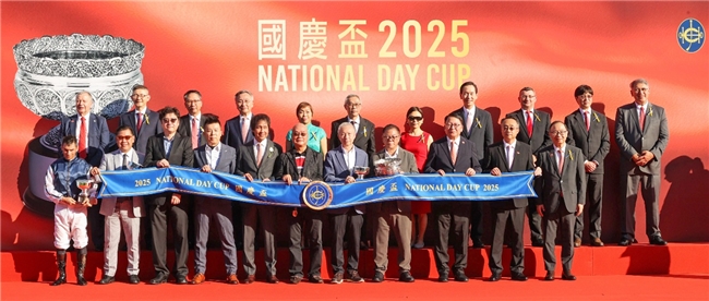 “国庆赛马日”开幕仪式在沙田马场马匹亮相圈举行。中华人民共和国外交部驻香港特别行政区特派员公署副特派员潘云东(前排左二)、香港赛马会主席廖长江(前排右二)、副主席黄嘉纯(前排左一)、赛马会一众董事及行政总裁应家柏(前排右一)一同为开幕仪式主礼。